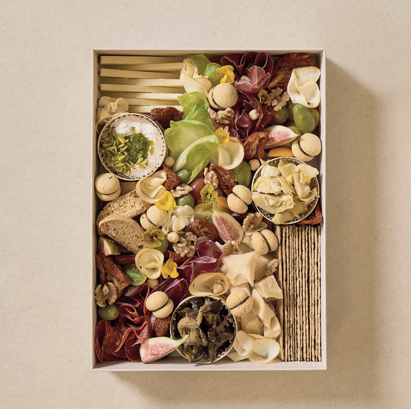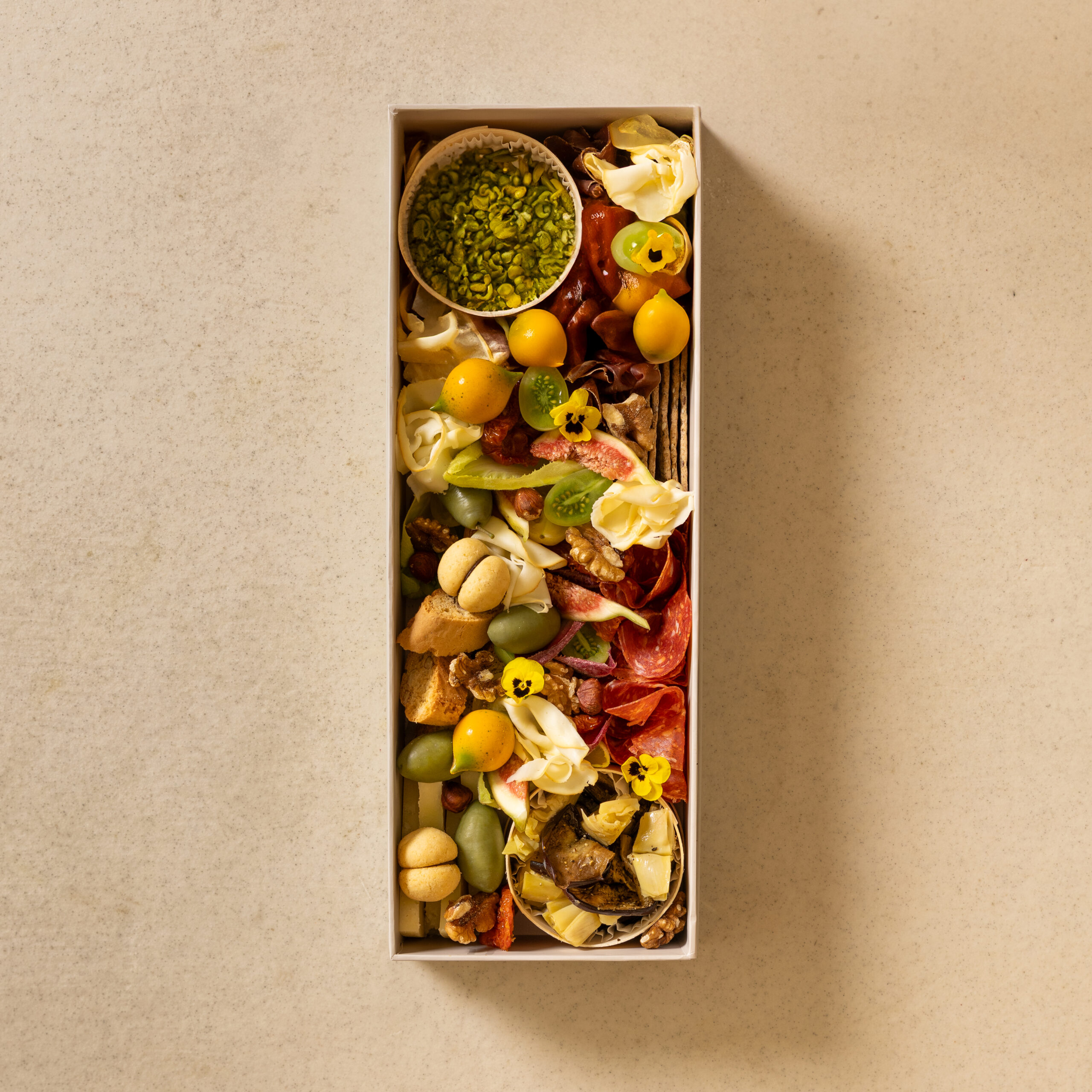 1. مزيج إيطالي: زيتون أخضر، طماطم مجففة، باذنجان، خرشوف مشوي مسكر