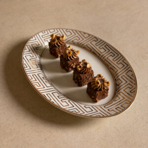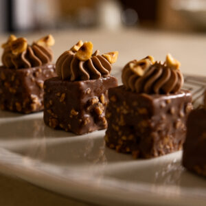 A delicate hazelnut crunch layered with praline and silky chocolate cream, combining texture and finesse in every bite — a refined harmony of crispness, smoothness, and pure indulgence.