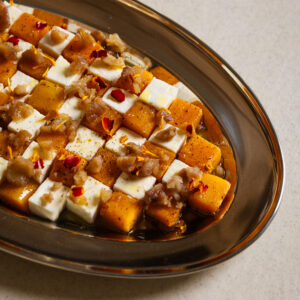 Tartlet of roasted aubergine petals, creamy feta, sumac and scattered blossoms — sun- drenched and sensually spiced.