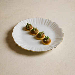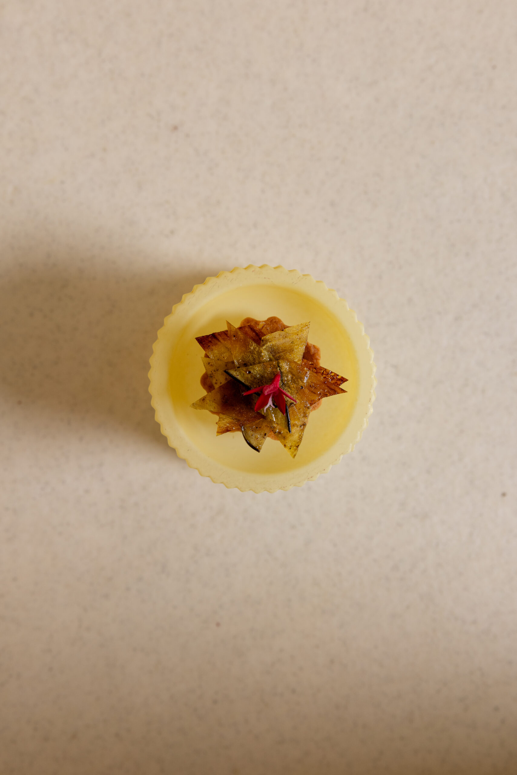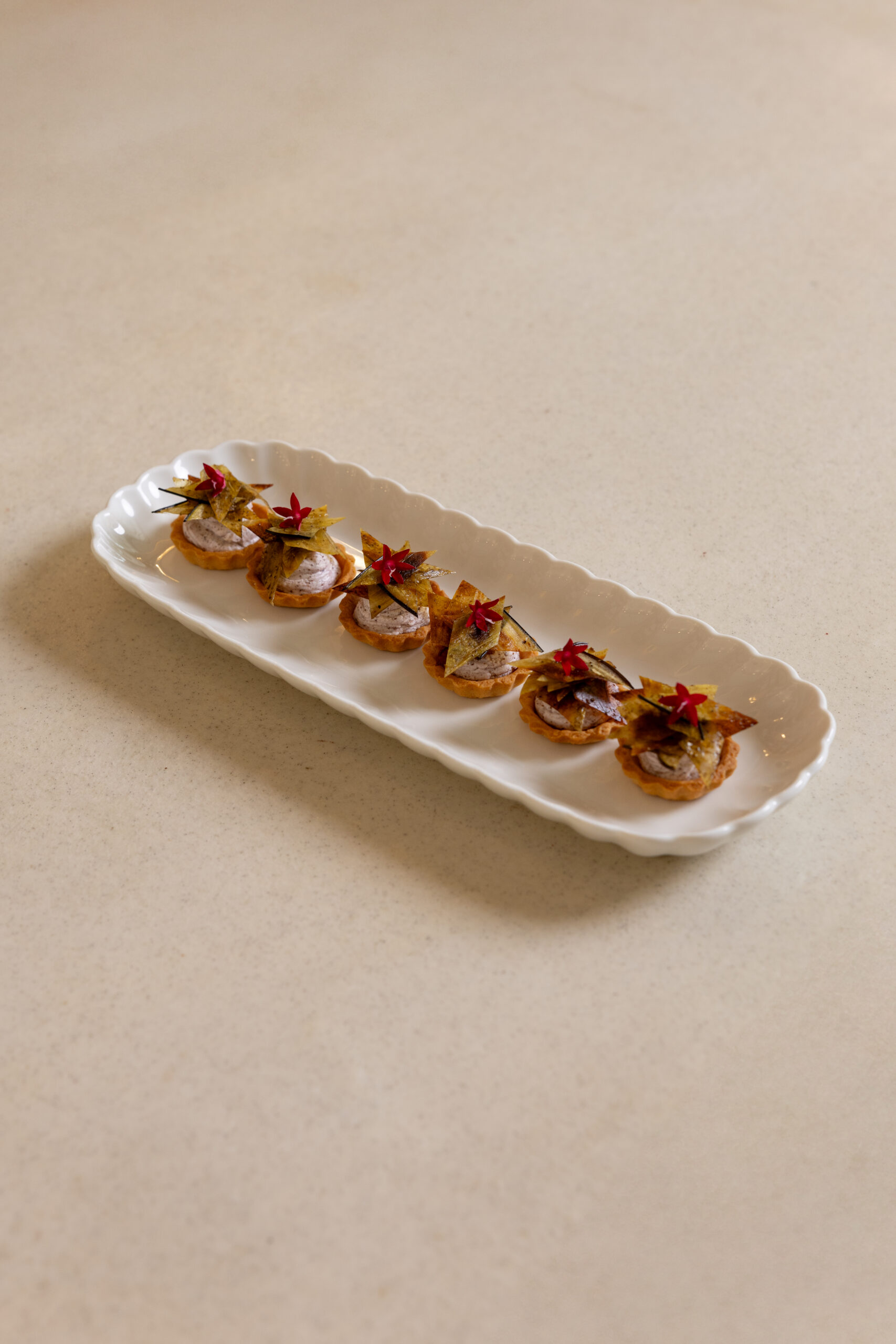 Tartlet of roasted aubergine petals, creamy feta, sumac and scattered blossoms — sun- drenched and sensually spiced.