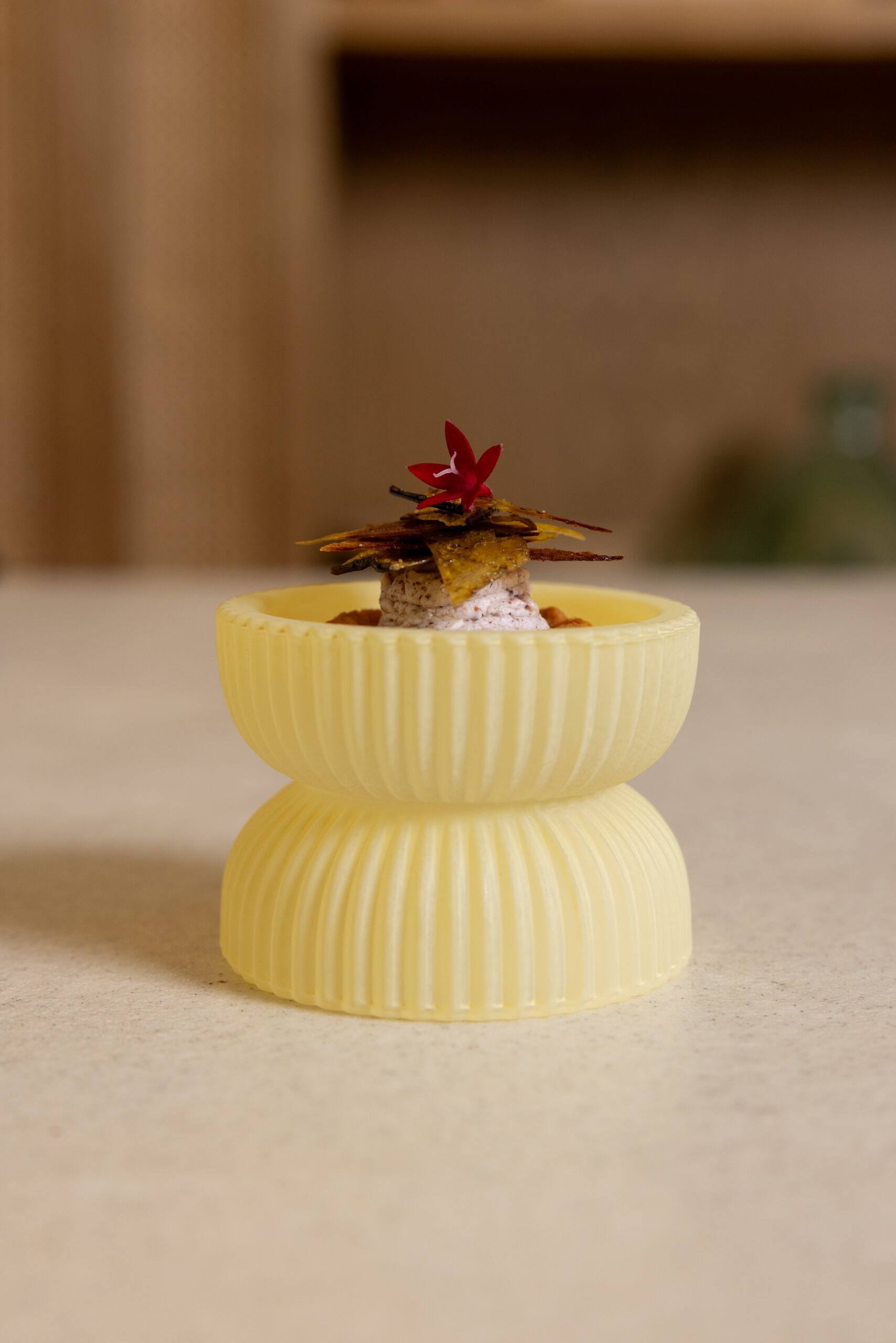 A crisp rice chip topped with cod tartare, corn, yuzu, Tajín spice, Sichuan pepper and edible flowers — zesty, crunchy, bright.