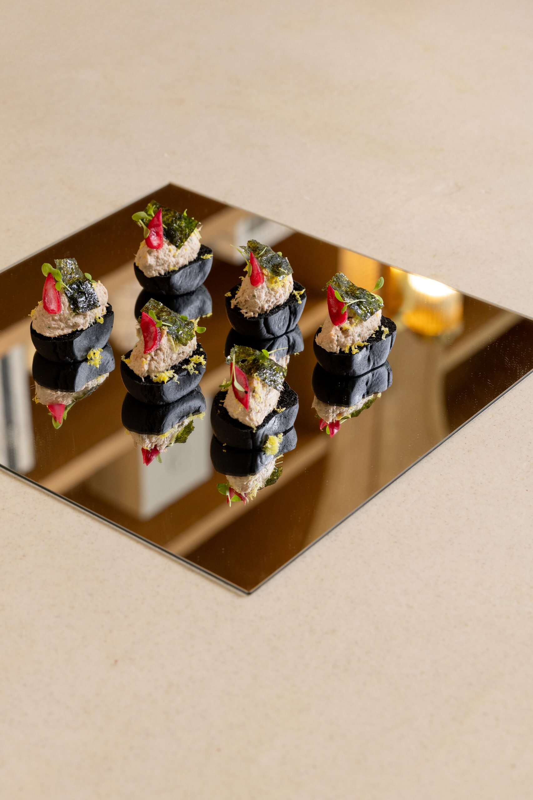 Soft charcoal bun with fresh dill tuna rillettes, lemon zest, pickled red onions, crunchy pistachios and a nori chip — all