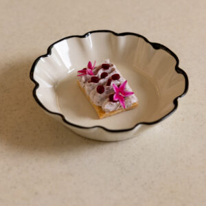 Flaky pastry topped with whipped goat cheese, a beetroot disc and petals — bold in colour, soft in soul.