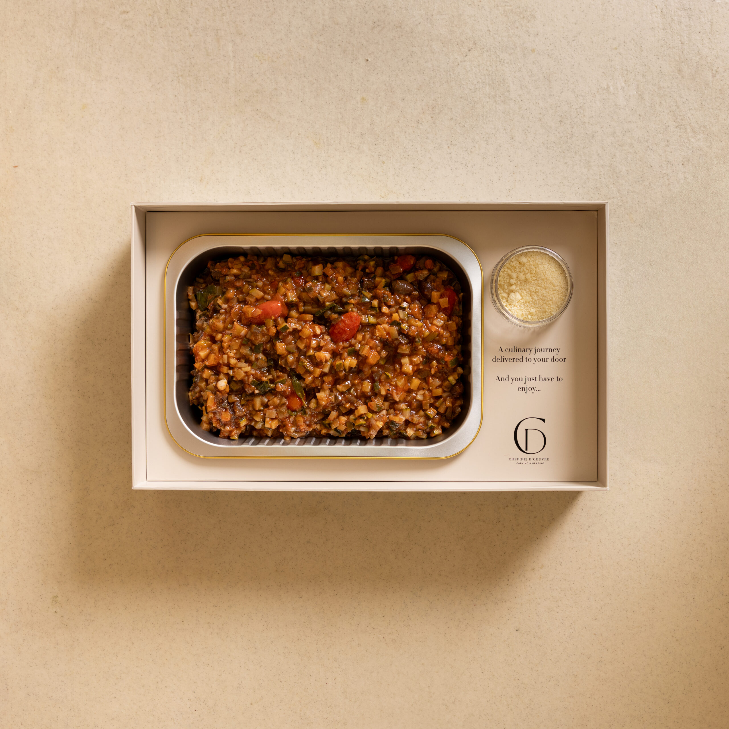 A vibrant medley of tender eggplants, zucchini, and slow-cooked candied tomatoes, elevated with fragrant basil, rich Taggiasca olives, and a touch of garlic and onion. This warm, hearty dish embodies the essence of Mediterranean flavors, bringing together sweetness, depth, and a delicate hint of spice. A true celebration of seasonal vegetables, crafted with love and passion.
