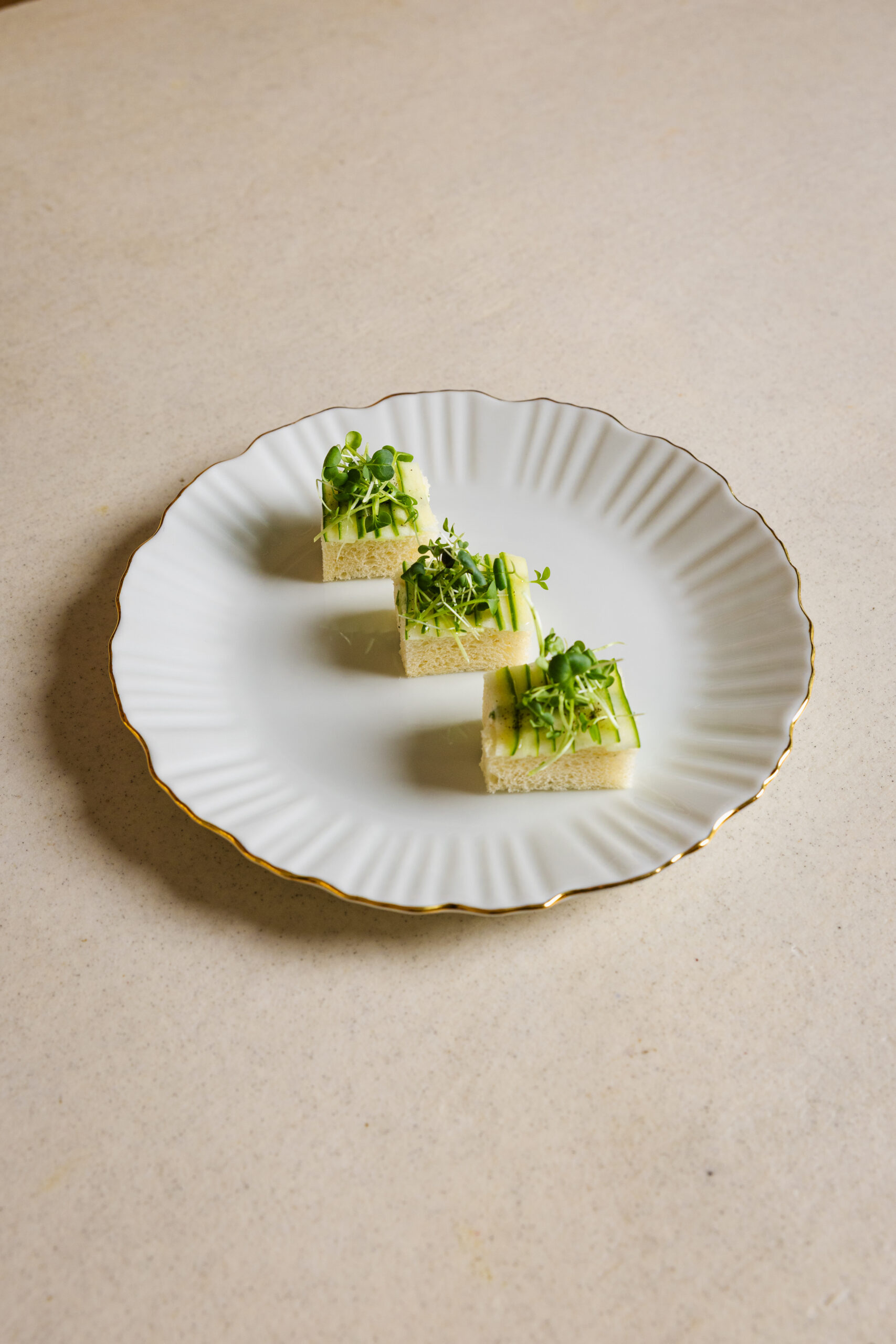 A fresh cucumber bite filled with yuzu cream, wrapped in silky cucumber ribbons.