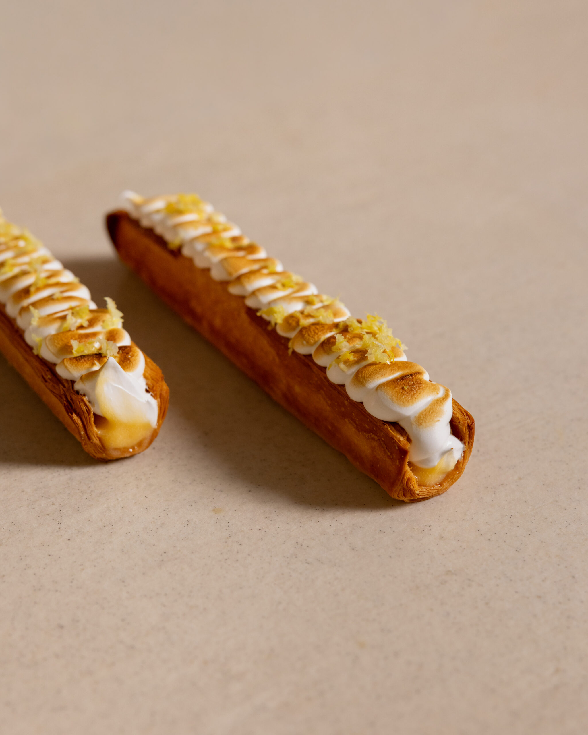 A bright, sunny puff pastry filled with zesty lemon cream and topped with a light, golden meringue. Bursting with freshness and radiance, each bite is a perfect balance of tangy and sweet .