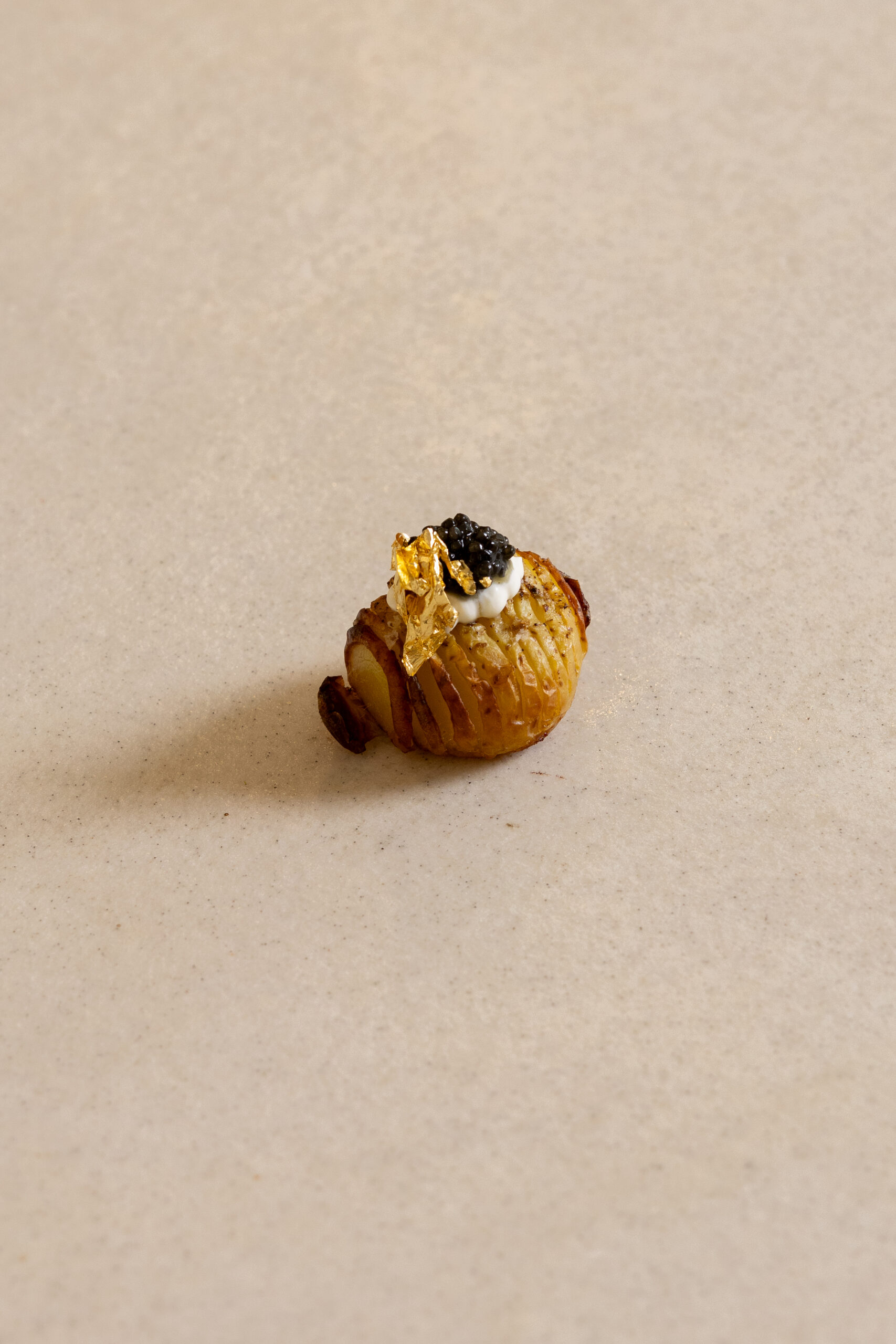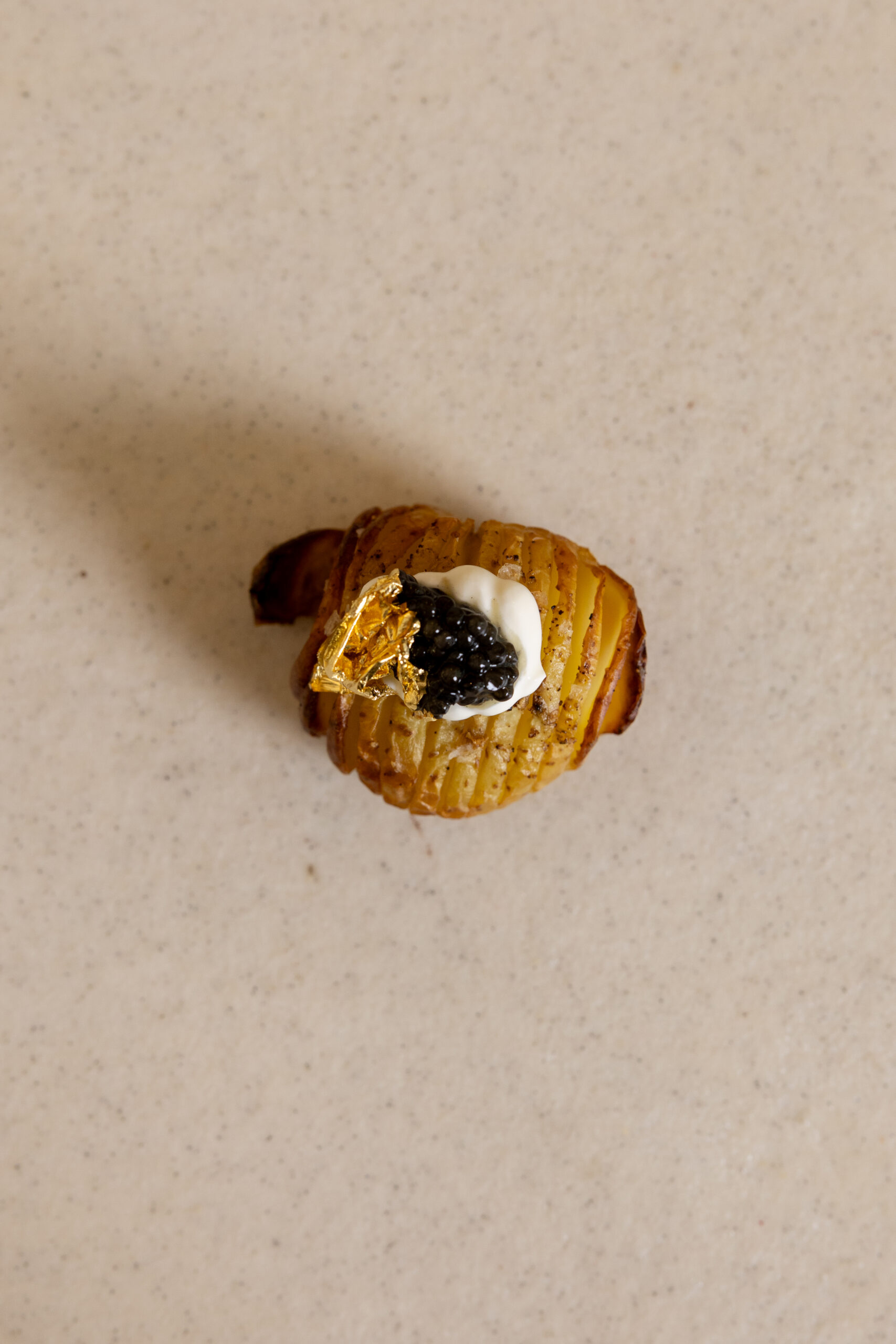 Warm fan-cut baby potato, light cream, caviar and gold leaf — indulgence in its purest, most elegant form.