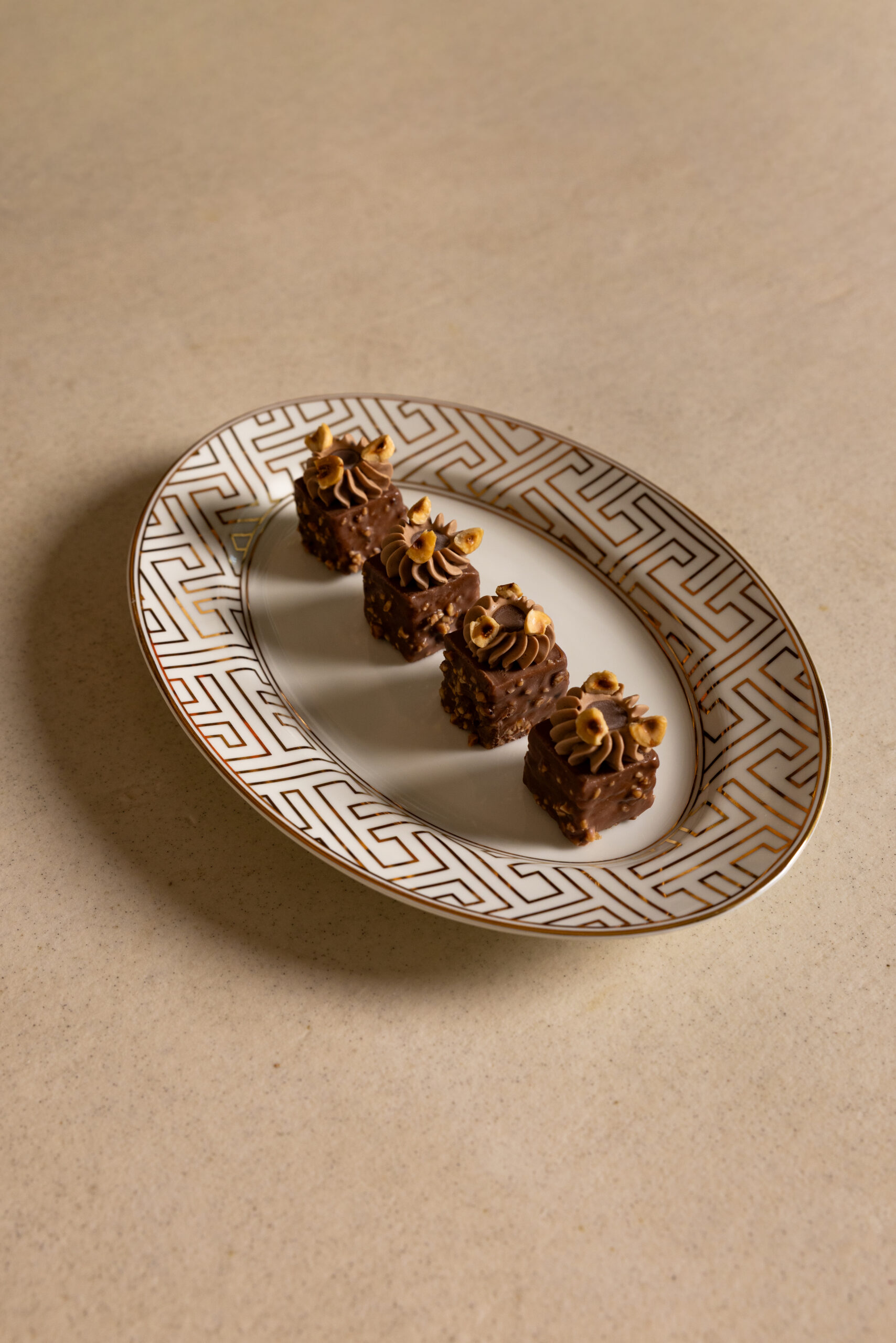 A delicate hazelnut crunch layered with praline and silky chocolate cream, combining texture and finesse in every bite — a refined harmony of crispness, smoothness, and pure indulgence.