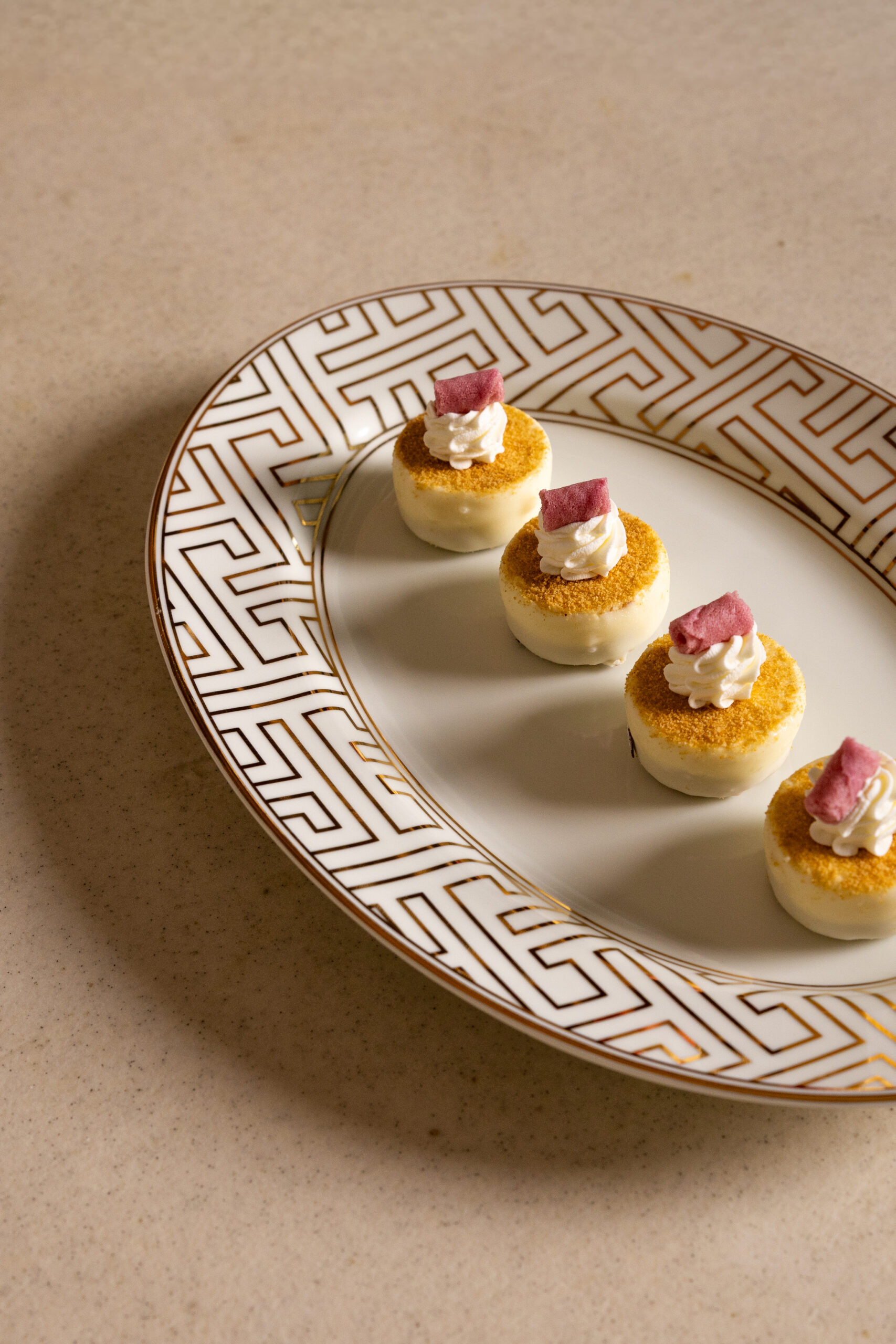 An elegant bite inspired by the purity of Italian snow — a crisp sablé base topped with a delicate vanilla cream cloud & raspberry , embodying refined simplicity and timeless grace.
