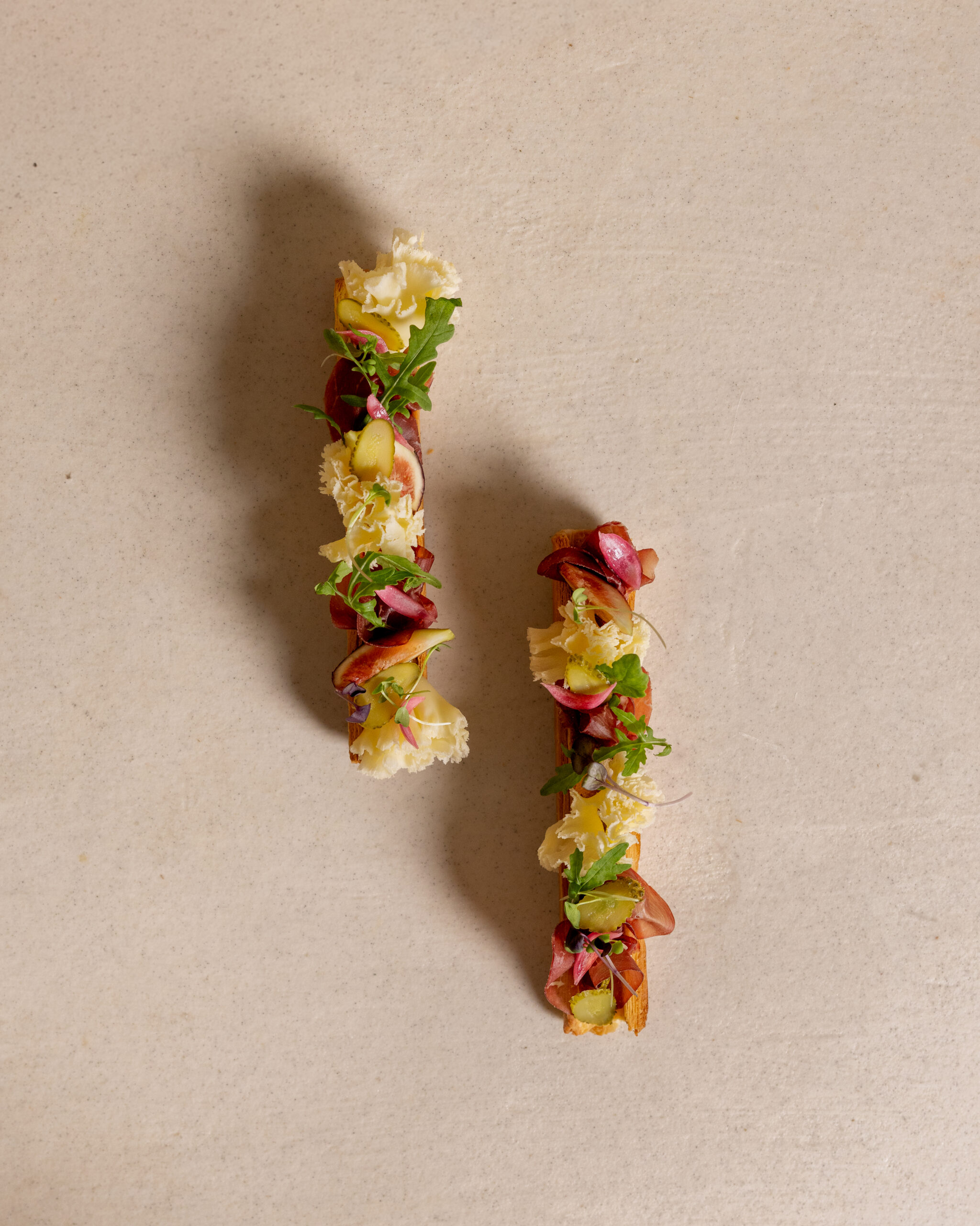 A golden puff pastry layered with Beef Bresaola, Tête de Moine , fresh figs, whipped semi-salted butter old grain mustard, and crunchy gherkins.