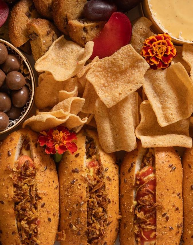 Lights, snacks, action, Dive into the ultimate movie-night experience with our homemade creations: crispy nachos with cheddar dip, gourmet hot dogs, fudgy brownies, Nutella doughnuts, chocolate-coated nuts, fluffy homemade marshmallows with rich chocolate sauce, buttery cookies, and a burst of fresh red fruits.